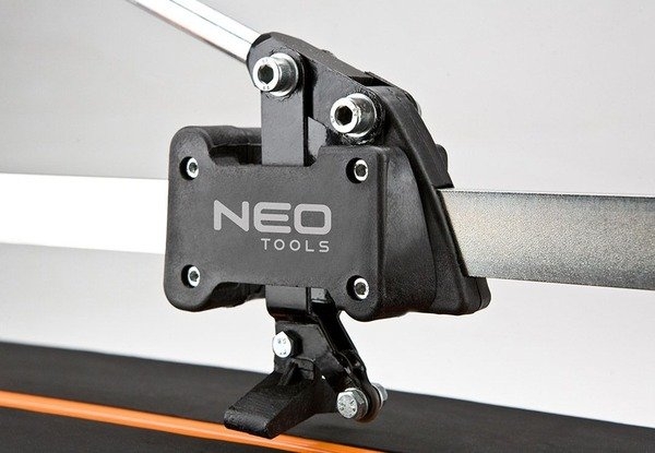 Плиткоріз Neo Tools, робоча частина 800х800 мм, амортизуюча робоча поверхня 56-005. Плікторез NEO із різальним ножем діаметром 16 мм. Оснащений одинарною напрямною із міцного смугового металу 30 x 12 мм. Завдяки голівці на підшипниках, можна отримати точніше розпилювання. Метрична шкала разом із косинцем дозволяють точно розташовувати керамічну плитку. Додатковою перевагою є наявність амортизованої робочої основи товщиною 2 мм, покритої пористою гумою, що допомагає відламувати плитку після надрізу.