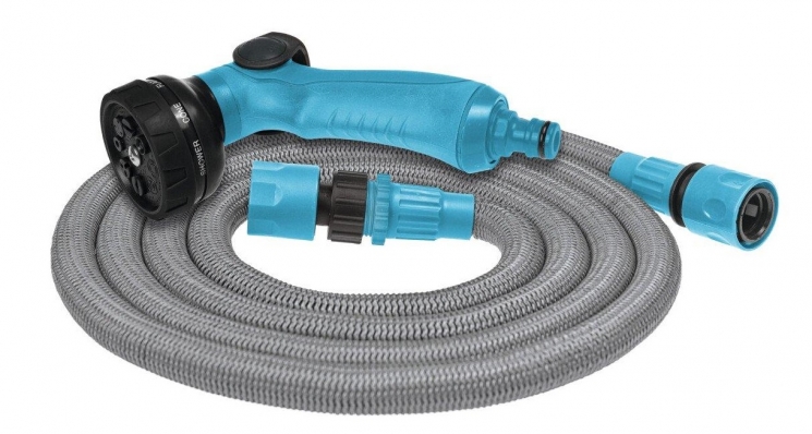 Набір для поливу Cellfast BASIC, шланг 7.5-22.5 м, що розтягується, зрошувач, комплект підключення 1/2-3/4" 19-047. У набір для поливу входить розширювальний шланг, 8-функціональний ручний спринклер, швидкісний з’єднувач шланга – потік води, багатофункціональний з’єднувач з внутрішньою різьбою – упор G3/4”, багатофункціональний з’єднувач з внутрішньою різьбою G1/2” – G3 /4”. Інноваційний і компактний садовий шланг, який збільшує свою довжину приблизно в три рази під час потоку води під тиском і скорочується автоматично після спорожнення.