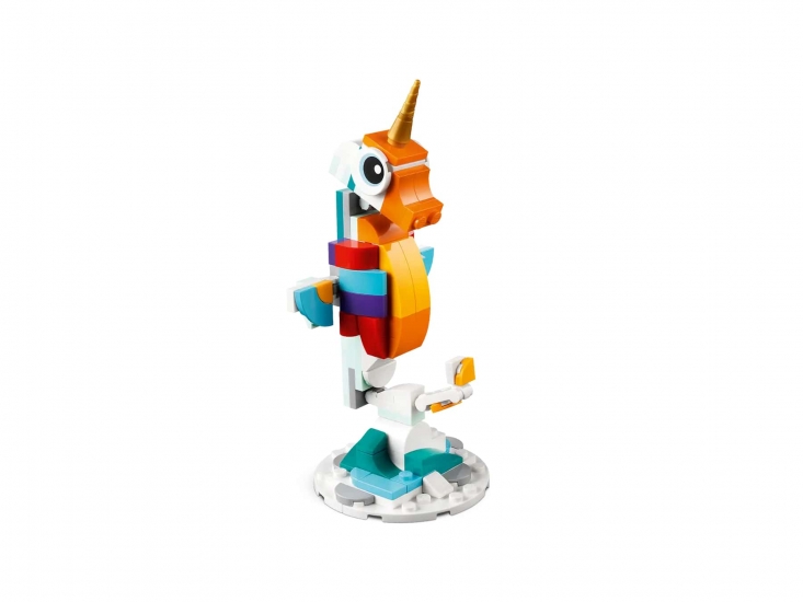 Магічні й таємничі пригоди не припиняться завдяки трьом різним чарівним істотам, яких можна зібрати із цим набором LEGO Creator 3-в-1 для маленьких будівельників. Вони можуть побудувати рухливу фігурку магічного єдинорога, переробити її на рухливу фігурку морського коника з підставкою на морському дні, а згодом перетворити модель на фігурку милого павича з барвистим хвостом. Діти навіть можуть використати кубики, щоб створити іншу чарівну істоту.
