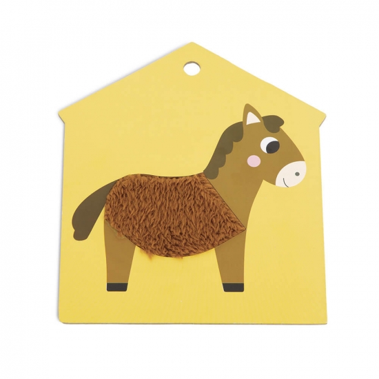 На цих картонних картках великі області з різною текстурою дозволяють маленьким ручкам знайомитися з різними матеріалами: м’якою шерстю кролика чи гладкою шкірою свині. Цей набір містить 6 карток із тваринами з матеріалами для дотику, сполучених знімним кільцем, щоб картки трималися разом і їх було легко носити з собою. Картка «ферма» з отвором спереду також дозволяє грати з картами в хованки. Для дітей з 12 місяців. Кожна картка має великі розміри 15,9 х 18,4 см, які дозволяють пильним малюкам легко їх схопити. Виготовлений з картону, сертифікованого FSCTM.