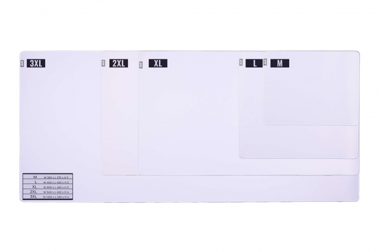 Граєте короткими чи розмашистими рухами? Насправді це має значення, бо виробник постарався і створив 5 варіантів розміру ігрових поверхонь. Якщо на столі порядок, все організовано та чисто – можна не морочитися надто великими килимками та вибрати розмір М чи L. Якщо ні, зверніть увагу на килимок максимального формату, що закриває всю робочу зону, – розміри від XL до 3XL. За товщини 3 чи 4 мм килимки легко згинаються.