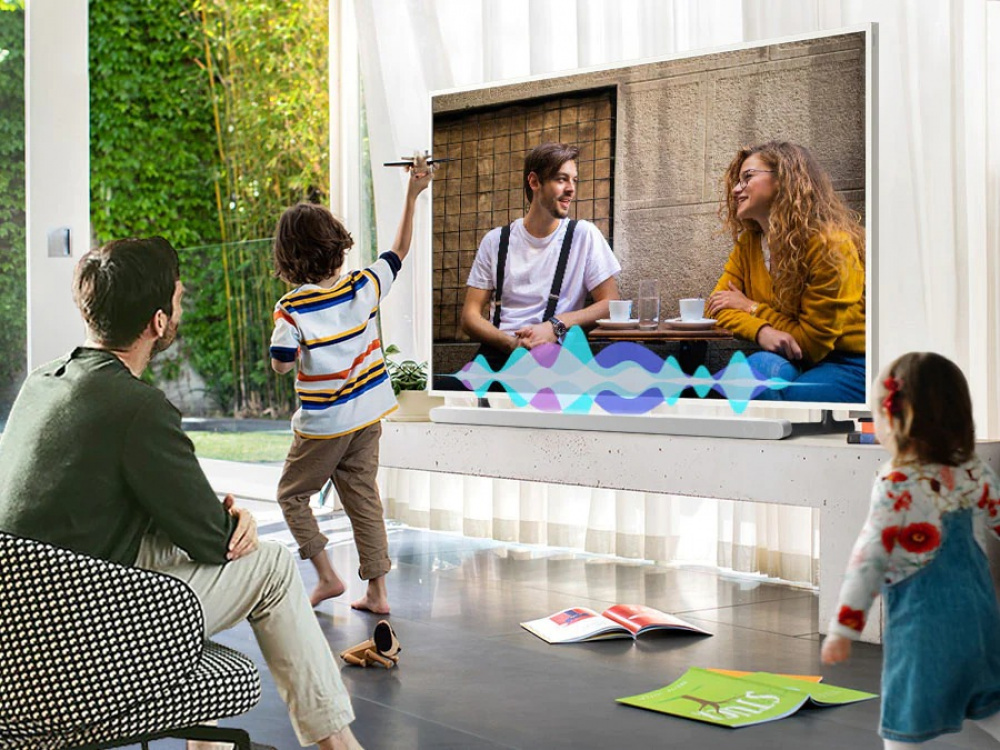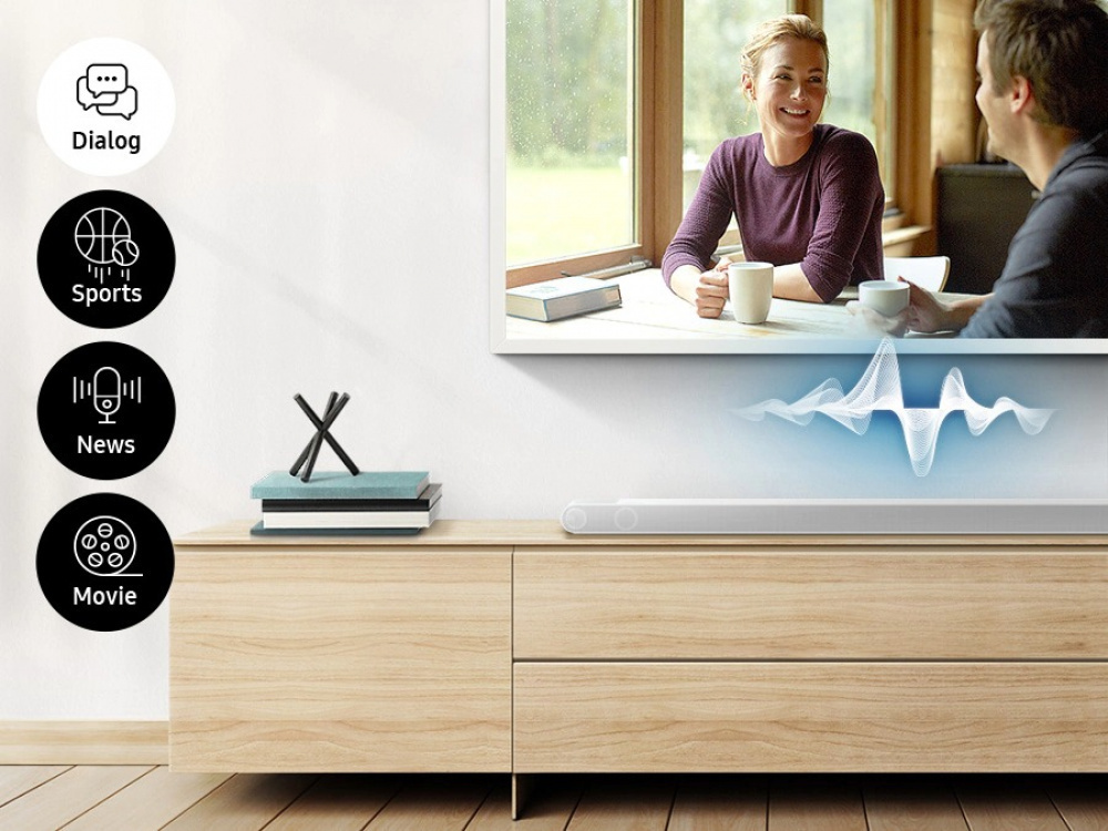 Саундбар Samsung аналізує звуковий сигнал і автоматично оптимізує звуковий супровід кожної сцени. Адаптивний звук дозволяє покращити чутність голосів акторів навіть за низького рівня гучності, коли зазвичай голоси ледве чутно.