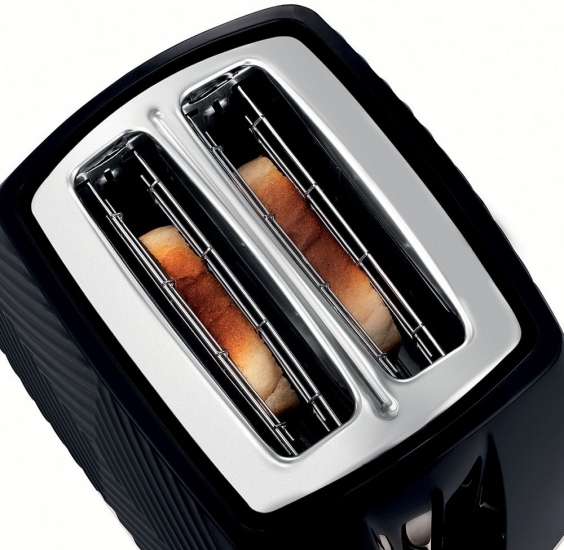 Тостер на 2 скибочки з сучасним тривимірним дизайном та вставками з нержавіючої сталі Хороший зовнішній вигляд поєднується із вражаючою продуктивністю Groove Toaster. Він має чисту, сучасну текстуровану поверхню, яка доповнює різноманітні стилі кухні.