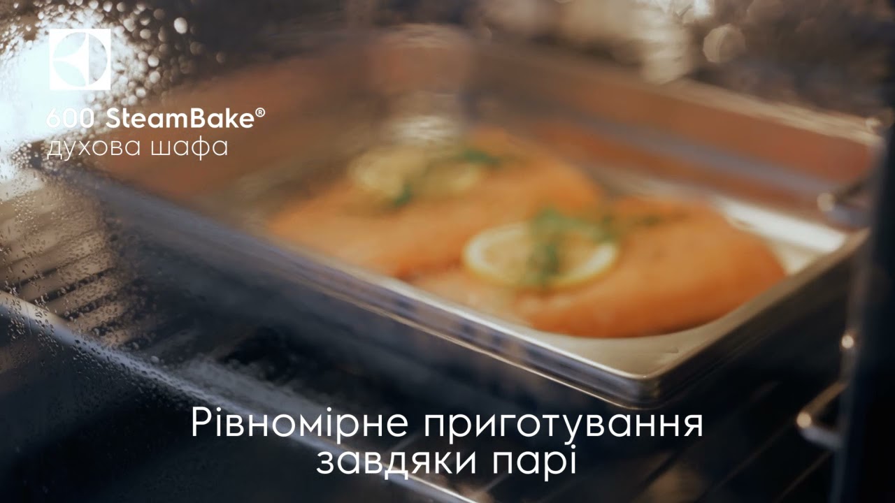 Додаючи пару, можна створювати апетитні кекси та ідеальні пироги вдома з духовою шафою 600 SteamBake. Насолоджуйтеся смаженою куркою, лазаньєю та рибою завдяки рівномірному приготуванню. Створення хрусткої скоринки та пухкої середини одним натиском кнопки. SteamBake для смачної випічки. Функція SteamBake дозволяє вдома створювати випічку як у професійних пекарнях одним натисненням кнопки. Волога дозволяє тісту повністю піднятися, створюючи чудову м'яку серединку, в той час як сухе тепло створює яскраву, хрустку скоринку. Насолоджуйтесь не лише смачною випічкою, але й смаженою куркою та рибою.