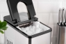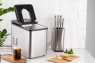 Корпус льодогенератора із нержавіючої сталі з чорною передньою панеллю. На кришці розташоване прозоре віконце, сенсорна панель керування з індикаторами живлення, відсутності води та повного заповнення кошика. У комплекті постачання є спеціальна лопатка, а швидкий злив води реалізований за допомогою клапана в нижній частині пристрою.