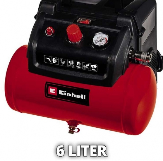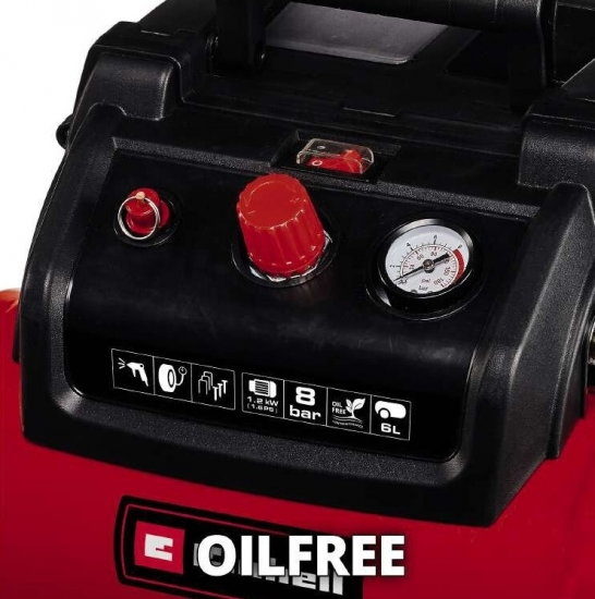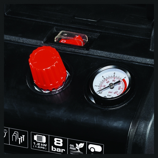 - Тиск компресора Einhell TC-AC 190/6/8 OF можна регулювати для різних завдань від 0 до 8 бар за допомогою регулятора тиску. Робочий тиск регулюється редуктором тиску і відображається на манометрі.