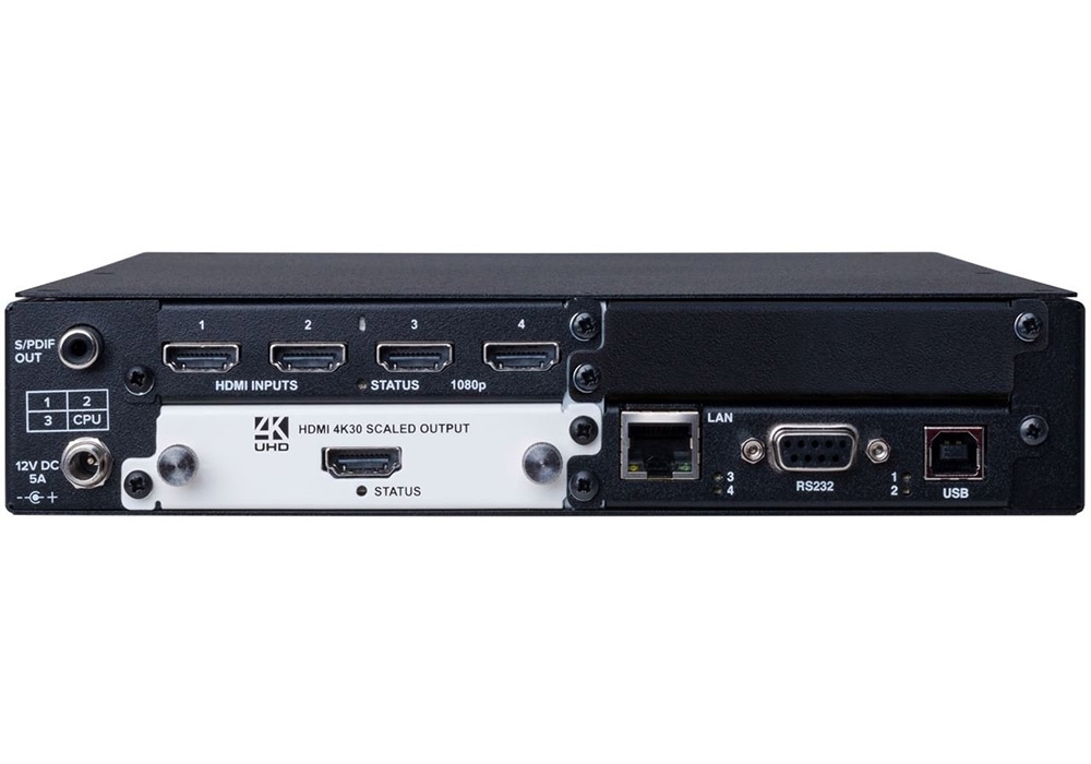 ЗВЕРНІТЬ УВАГУ: встановлення модулів можливе тільки в сервісному центрі компанії tvONE. На самому шасі: 1 вихід цифрового аудіо S/PDIF (RCA), один блок живлення, порти для керування: RS-232/422/485, USB, IP. Працює під управлінням ПЗ CORIOgrapher. 32 заводських пресети. Висота корпусу 1U.
