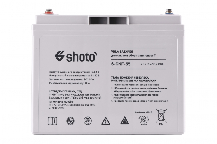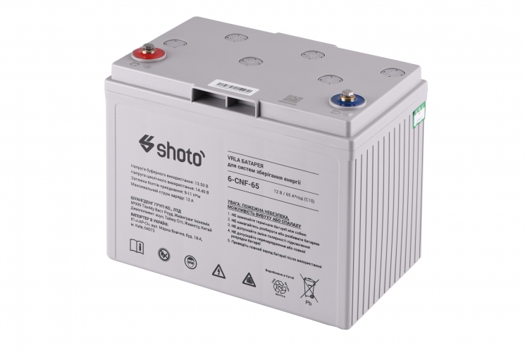 Акумуляторна батарея SHOTO 6CNF. Переваги моделі: подовжений термін експлуатації – до 20-ти років, відмінна циклічність використання, необслуговувана на всьому протязі експлуатації, низька вартість використання.