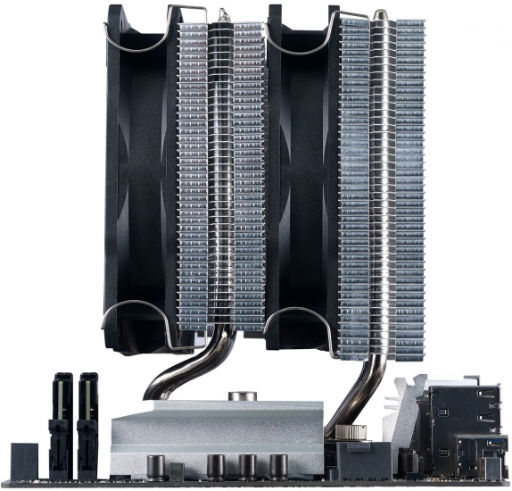 - два 120мм PWM вентилятора з дев'ятьма лопатями та можливістю регулювання швидкості їх обертання в діапазоні від до 1850 rpm за допомогою PWM контролера. 120мм PWM вентилятори із спеціальною формою лопатей. Ця особливість сприяє створенню активного повітряного потоку та ефективного відведення тепла від радіатора. Елементи управління методом широтно-імпульсної модуляції автоматично регулюють швидкість вентилятора відповідно до температури процесора, для зниження рівня шуму і для забезпечення оптимальної продуктивності. При підключенні роз'єму вентилятора CPU на материнській платі автоматично вмикається PWM управління вентилятором;