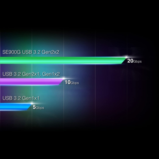 SE900G підтримує надвисоку швидкість специфікації USB 3.2 Gen2 x2, згідно з якою швидкість передачі даних досягає 20 Гбіт /с. А це до двох разів швидше в порівнянні з інтерфейсом USB 3.2 Gen2 x1 і вчетверо швидше, ніж USB 3.2 Gen1 x1.