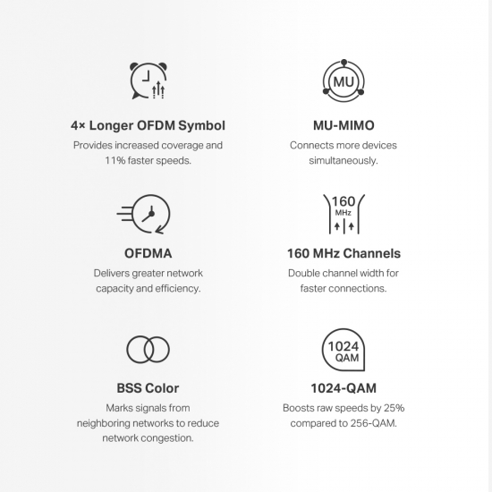 • Дводіапазонний Wi-Fi 6 зі швидкістю до 3000 Мбіт/с – 2402 Мбіт/с на 5 ГГц і 574 Мбіт/с на 2,4 ГГц.