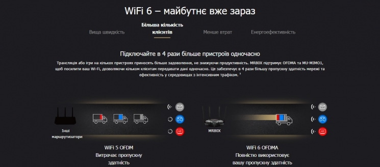 Нова ера домашнього WiFi дводіапазонний маршрутизатор Wi-Fi 6 AX3000. Більше цілеспрямованих сигналів, які проникають через стіни. Чотири зовнішні антени з високим коефіцієнтом посилення, озброєні інтегрованими підсилювачами сигналу, забезпечують потужний сигнал WiFi, який досягає більшої відстані. Beamforming виявляє підключені пристрої користувачів та концентрує силу бездротового сигналу на них, роблячи з’єднання більш стабільними. Smart Connect дозволяє кожному з бездротових діапазонів MR80X використовувати однакові налаштування бездротового зв’язку. MR80X балансує попит на мережу та призначає пристрої до діапазону з найкращим сигналом і швидкістю. Це забезпечує оптимальну роботу пристроїв, коли користувачі ходять по дому.