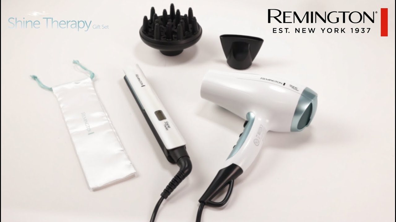 Додати посилання до Фен+випрямляч Remington набір Shine Therapy, 2300Вт, 3 режими, дифузор,щипці для волосся(150-230°С,кераміка), біло-блакитний: