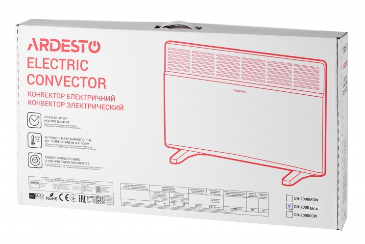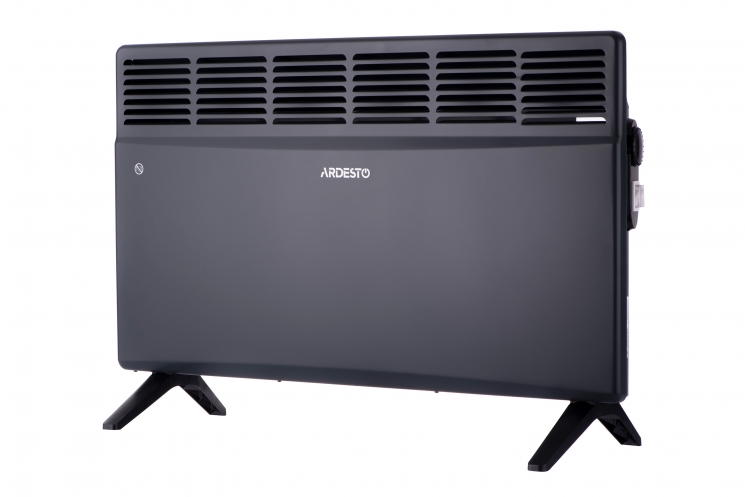 Ardesto CH-2000MCA використовує надійні комплектуючі – закритий обребрений нагрівальний елемент німецької компанії Eihenauer, а також італійський високоточний біметалічний термостат. Відсутність рухомих компонентів і продумана конструкція повністю виключає будь-які шуми при роботі. Механічне управління складається з клавіші вмикання із захисною накладкою та поворотного регулятора потужності. Конвектори Ardesto підтримують два типи монтажу – настінний і підлоговий. Кронштейни та опори поставляються в комплекті з обігрівачем.