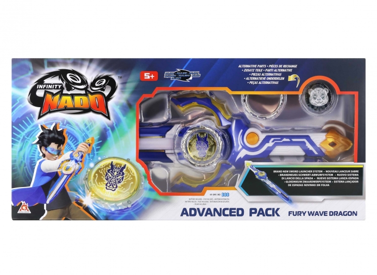 Infinity Nado VI серії Advanced Pack – дзиґа нового 6 покоління зазнала значних вдосконалень, що беззаперечно подарують нові емоції від ще більш видовищних та цікавих поєдинків. Абсолютно нова система запуску дзиґи на арену реалізована за допомогою епічного лаунчера у вигляді меча, що має більший розмір і вдосконалений зовнішній вигляд, пускова система покликана забезпечить контрольований швидкісний запуск.