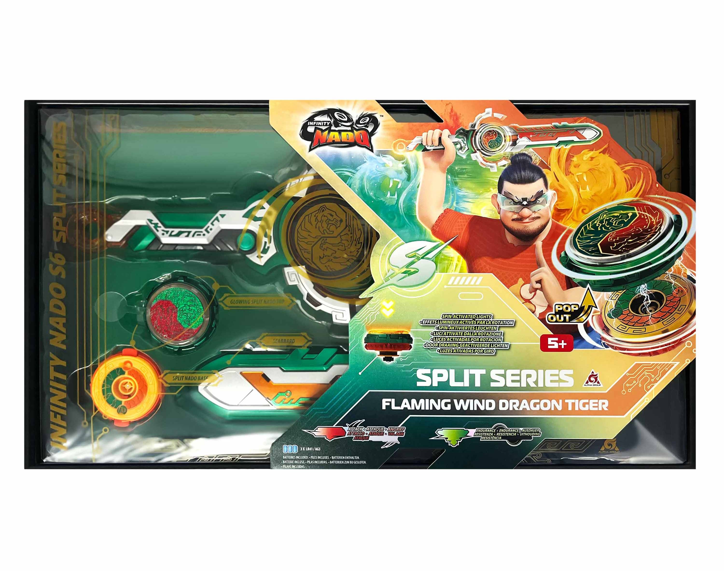 Infinity Nado VI серії Split Series – дзиґа нового 6 покоління зазнала значних вдосконалень, що беззаперечно подарують нові емоції від ще більш видовищних та цікавих поєдинків. Абсолютно нова система запуску дзиґи на арену реалізована за допомогою епічного лаунчера у вигляді меча, що має більший розмір і вдосконалений зовнішній вигляд, пускова система покликана забезпечить контрольований швидкісний запуск.