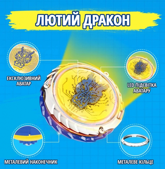 Високі показники дзиґи в поєдинку забезпечуються збалансованим поєднанням металевого кільця, стійкої металевої основи і ексклюзивного аватару.