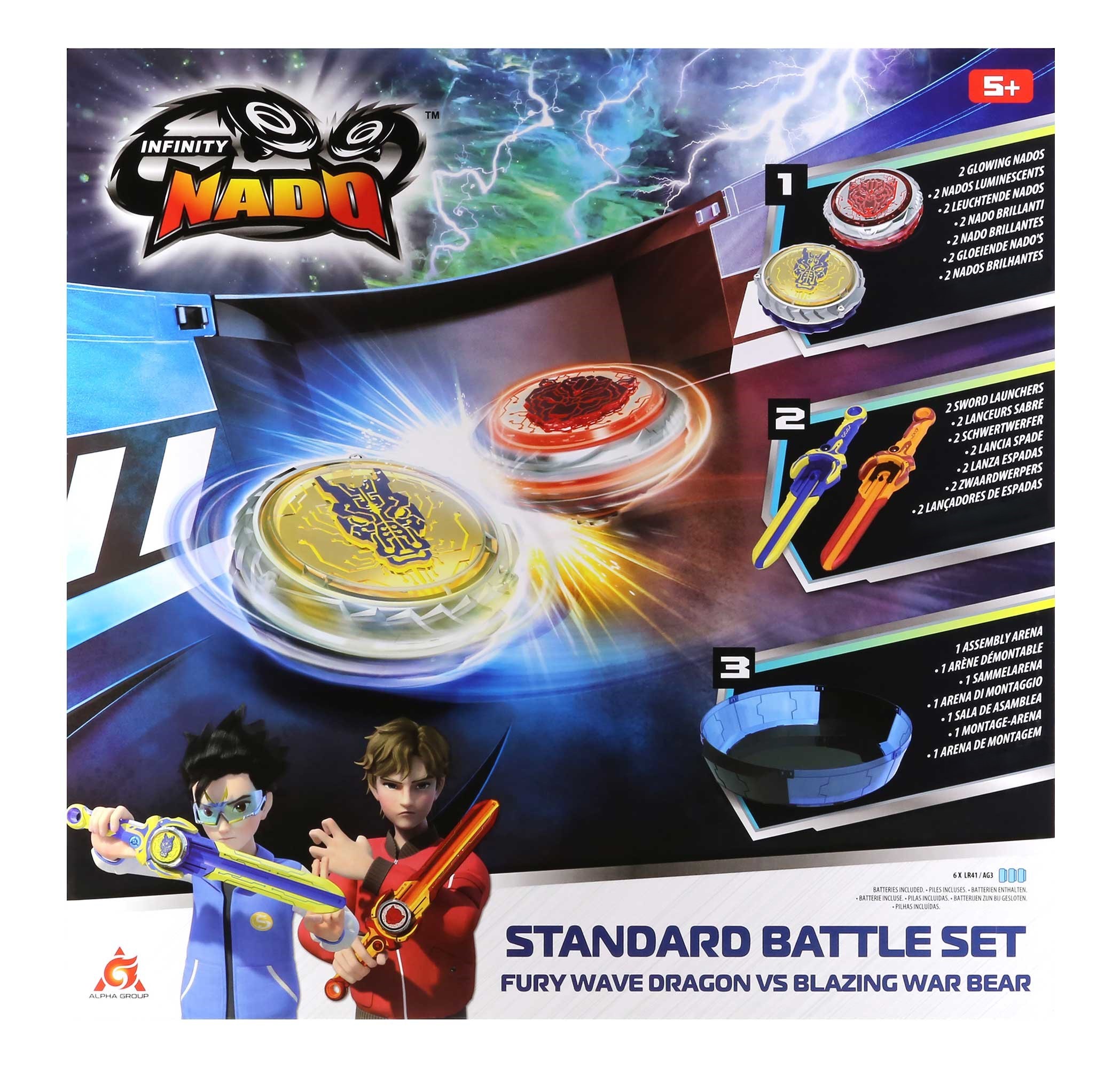 Infinity Nado VI Battle Set – ігровий набір з дзиґами нового 6 покоління, що зазнав значних вдосконаленнь, що беззаперечно подарують нові емоції від ще більш видовищних та цікавих поєдинків. Абсолютно нова система запуску дзиґи на арену реалізована з допомогою епічного лаунчера у вигляді меча, пускова система покликана забезпечить контрольований швидкісний запуск. Нова бойова арена має вдосконалене покриття та складну конструкцію для більш зручного зберігання між захопливими баталіями. До складу набору входять дві дзиґи Fury Wave Dragon і Blazing War з LED-підсвічуванням, два пускових лаунчера у вигляді мечів і ігрової арени.