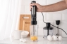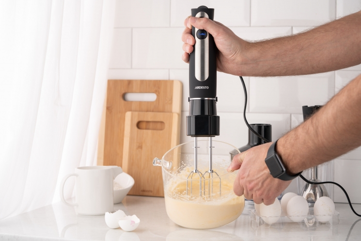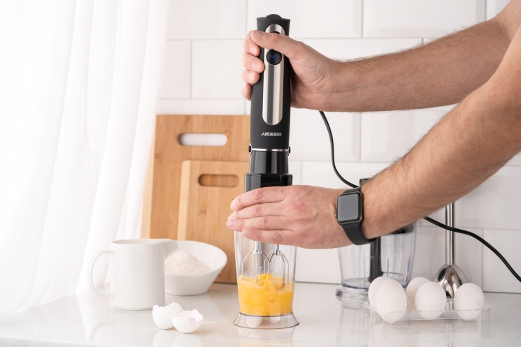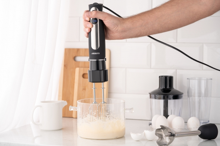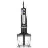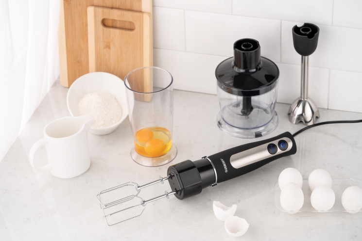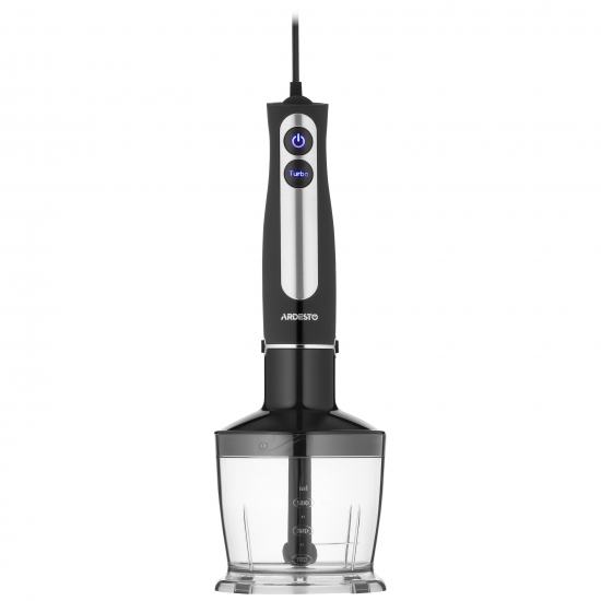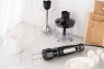 Пристрій має тонке ергономічне руків’я зі спеціальним протиковзким покриттям і підсвічуванням кнопок керування. Лезо виготовлено з нержавіючої сталі, на ніжці передбачено захист від розбризкування. У комплекті є мірна чаша об’ємом 600 мл, подрібнювач (500 мл) і насадка для збивання. Довжина кабелю живлення становить 1,3 м.