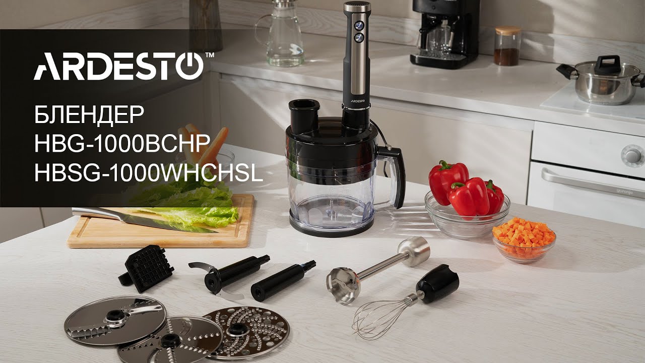 Пристрій має тонке ергономічне руків’я зі спеціальним протиковзким покриттям і підсвічуванням кнопок керування. Лезо виготовлено з нержавіючої сталі, на ніжці передбачено захист від розбризкування. У комплекті є: чаша об’ємом 2 000 мл, насадка для збивання, насадка для нарізання кубиками, насадка для нарізання у формі картоплі фрі. Довжина кабелю живлення становить 1,3 м.