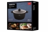 Особливістю виробу є знімні силіконові накладки на алюмінієві руків’я, які забезпечують комфортне та безпечне переміщення каструлі, навіть коли вона розігріта. Скляна кришка, що також міститься в комплекті, має отвір для відведення пари. Каструля ARDESTO Gemini Anzio сумісна з усіма видами плит, а саме: газовими, електричними, склокерамічними, галогенними та індукційними. Допустиме миття в посудомийній машині.