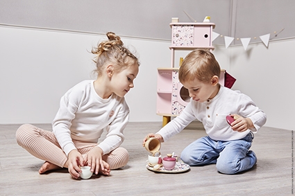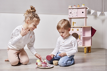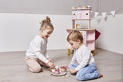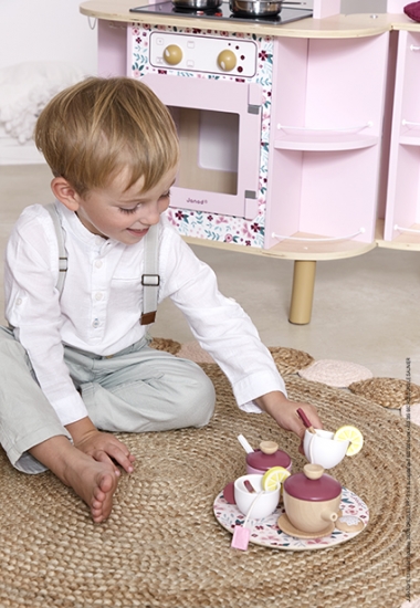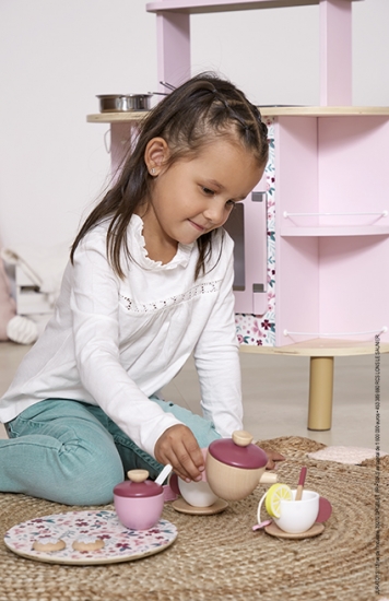 До цієї чудової дитячої кухні з квітковим малюнком входить 8 аксесуарів. Прикріпіть 6 повстяних подушечок під ніжками, щоб кухню можна було легко відкривати та закривати. У закритому вигляді кухня має розміри 55 x 47 x 87 см.