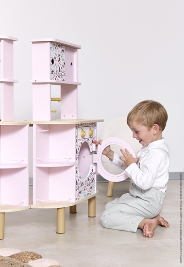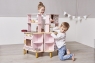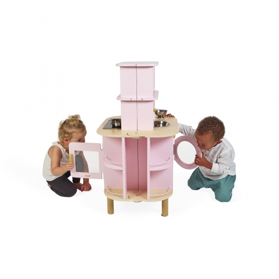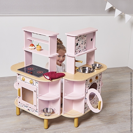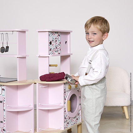 Він дуже добре оснащений металевою раковиною, дерев'яним краном і індукційною плитою зі звуком і світлом. Просто натисніть червоні кнопки один раз, щоб конфорки засвітилися, потім другий раз, щоб почути звук кипіння води. Звукові та світлові ефекти вимкнуться автоматично через 30 секунд або після третього натискання кнопок. Щоб увімкнути духовку та пральну машину, немає нічого простішого, кожна з них оснащена двома обертовими кнопками зі звуковими ефектами. Дверцята магнітні, а прозоре скло дозволяє переконатися, що машина точно закінчила роботу! 4 розсувні двері дозволяють зберігати форми для кексів та інші смаколики. Всередині кухні є 2 додаткових шафи для зберігання посуду та інших аксесуарів. Також передбачені привабливі металеві гачки для підвішування лопатки та шумівки!