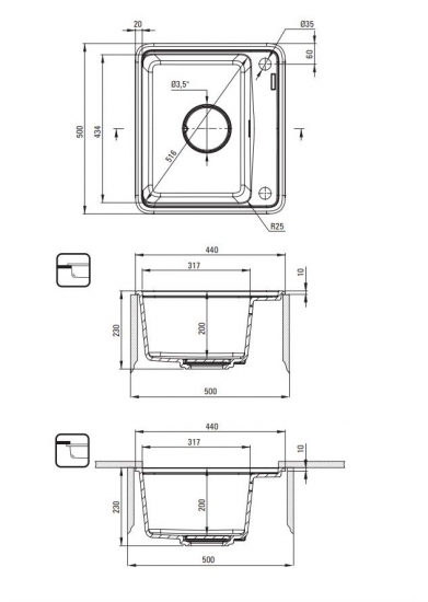 Опис Мийка кухонна Deante Momi, граніт, квадрат, без крила, 500х440х230мм, чаша - 1, врізна, металічний графіт + кухонна дошка