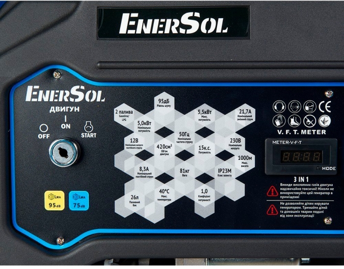Однофазний переносний газо-бензиновий генератор EnerSol EPG-5500SEL - потужне та надійне джерело енергії, з комбінованою паливною системою, що працює на пропан-бутані та бензині АІ-92 або 95. Міні-електростанція характеризується робочою потужністю 5 кВт (пікова - 5.5 кВт), обладнаний цифровим мультиметром, функцією стабілізації напруги, що робить його ідеальним для використання в якості резервного джерела живлення для чутливої сучасної електронної техніки Також генератор має електростартер, який полегшує процес запуску.