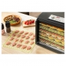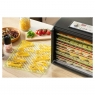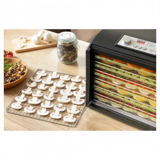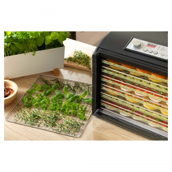 Сушарка великого об'єму із загальною площею сушіння 1,18 м2 (на 65 % більше звичайної сушарки з діаметром 32 см). Регулювання температури за допомогою поворотного регулятора для інтуїтивного керування. Налаштування часу за допомогою режиму швидкого налаштування. 6 металевих та 6 пластмасових термостійких підносів гарантують максимальний комфорт. 1 піддон для приготування продуктів RAW.