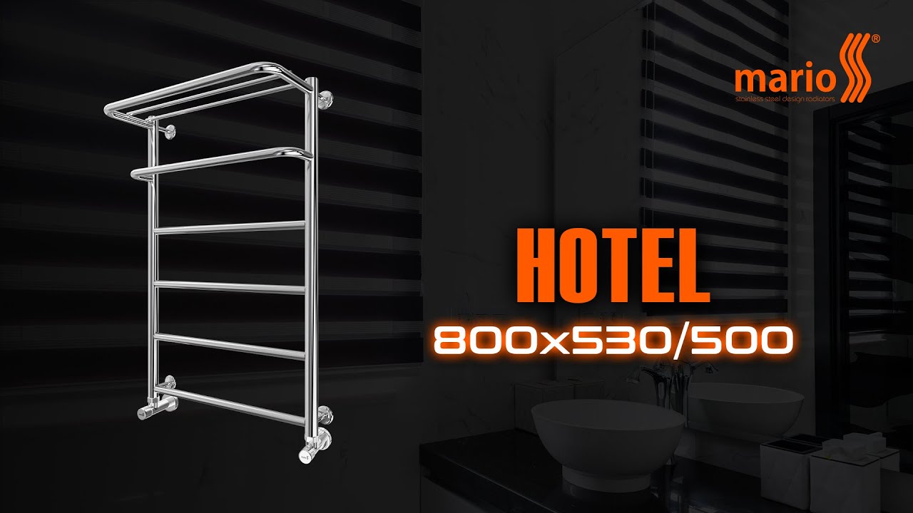 Рушникосушарка "Маріо" Стандарт 800х530/500. Розміри: висота - 800 мм, ширина - 530 мм, глибина 170 мм, міжцентрова відстань для підключення - 500 мм, діаметр підключення G1/2''. Варіанти підключення: нижнє, діагональне та бічне. Кількість ребер - 8, стояки з круглої труби. Виготовлена з полірованої нержавіючої сталі без хромування. Варіанти покриття: полірована або сатин, чорний мат, білий глянець, золото, бронза.