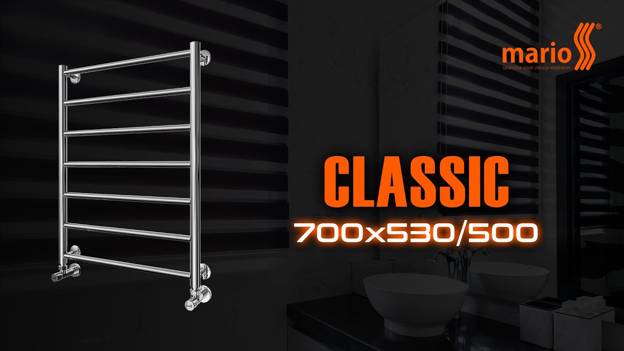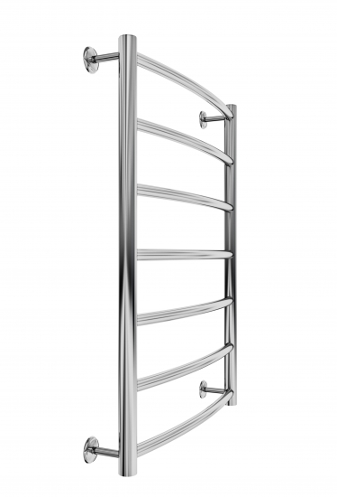 Рушникосушарка "Маріо" Стандарт 800х530/500. Розміри: висота - 800 мм, ширина - 530 мм, глибина 170 мм, міжцентрова відстань для підключення - 500 мм, діаметр підключення G1/2''. Варіанти підключення: нижнє, діагональне та бічне. Кількість ребер - 8, стояки з круглої труби. Виготовлена з полірованої нержавіючої сталі без хромування. Варіанти покриття: полірована або сатин, чорний мат, білий глянець, золото, бронза.
