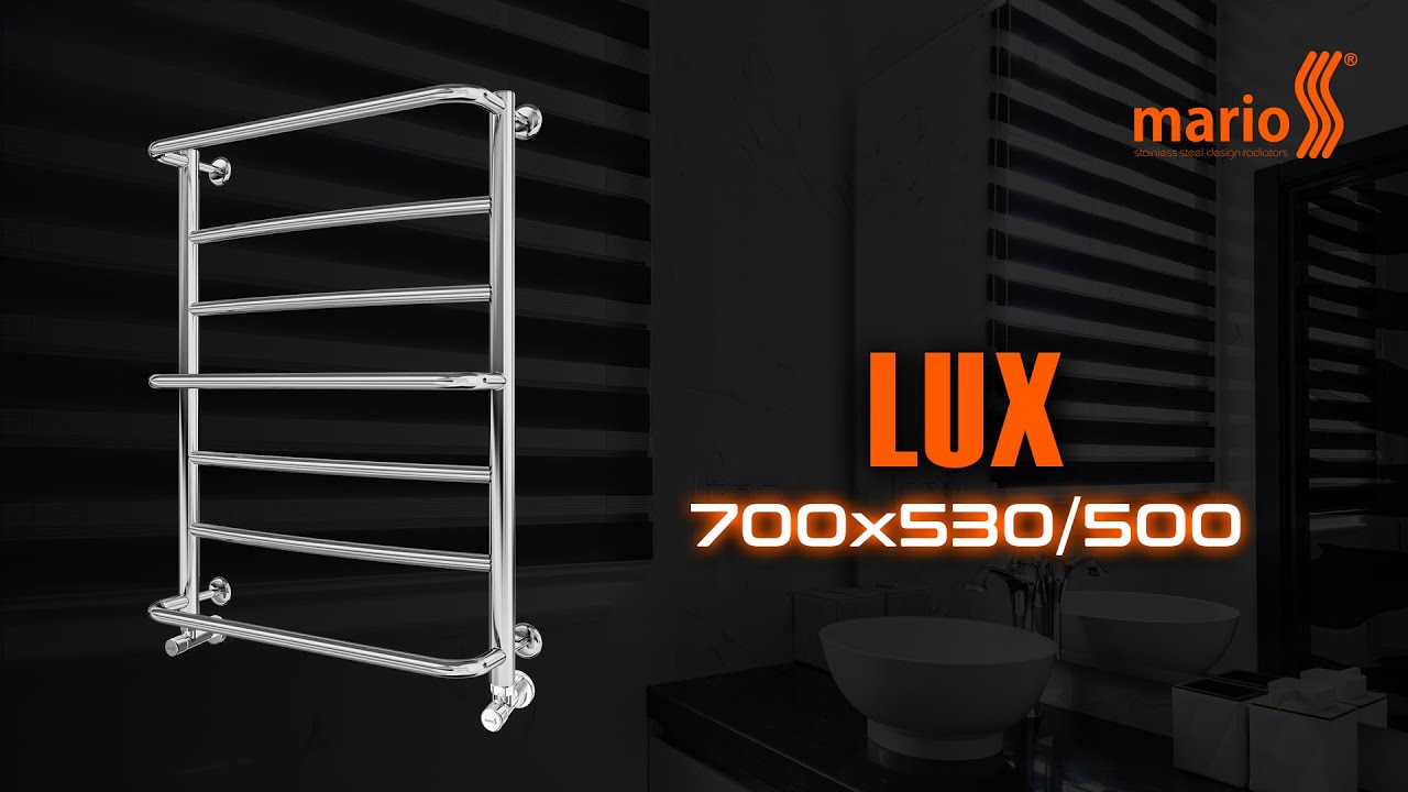 Рушникосушарка "Маріо" Стандарт 800х530/500. Розміри: висота - 800 мм, ширина - 530 мм, глибина 170 мм, міжцентрова відстань для підключення - 500 мм, діаметр підключення G1/2''. Варіанти підключення: нижнє, діагональне та бічне. Кількість ребер - 8, стояки з круглої труби. Виготовлена з полірованої нержавіючої сталі без хромування. Варіанти покриття: полірована або сатин, чорний мат, білий глянець, золото, бронза.