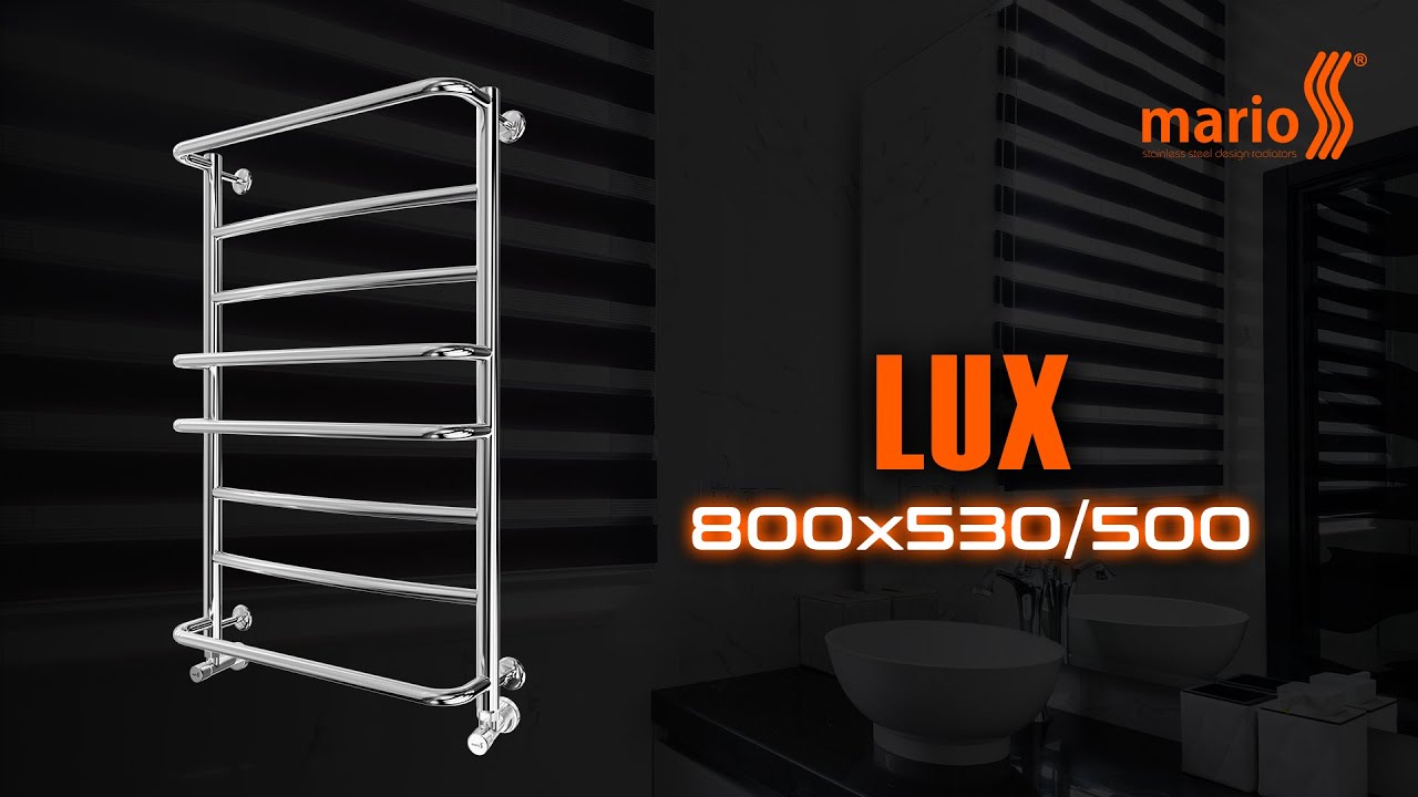 Рушникосушарка "Маріо" Люкс 800х530/500. Розміри: висота - 800 мм, ширина - 530 мм, глибина 170 мм, міжцентрова відстань для підключення - 500 мм, діаметр підключення G1/2''. Варіанти підключення: нижнє, діагональне та бічне. Кількість ребер - 8, стояки з круглої труби. Виготовлена з полірованої нержавіючої сталі без хромування.
