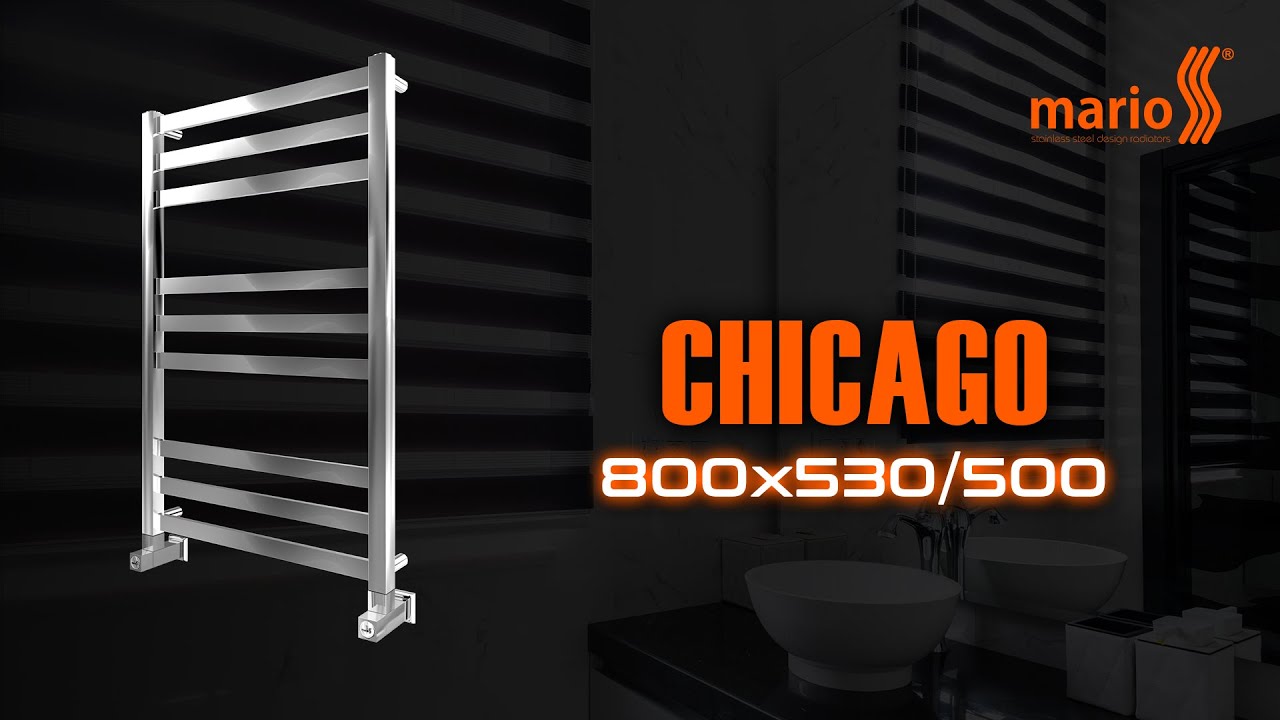 Водяна рушникосушарка Чікаго 800х530 з міжцентровою відстанню для підключення 500мм, діаметр підключення G 1/2 '' складається з 9 ребер. Рушникосушарка Чикаго заводу виробника Mario виготовлена з нержавіючої сталі АІSI 304 може бути укомплектована електричним теном.