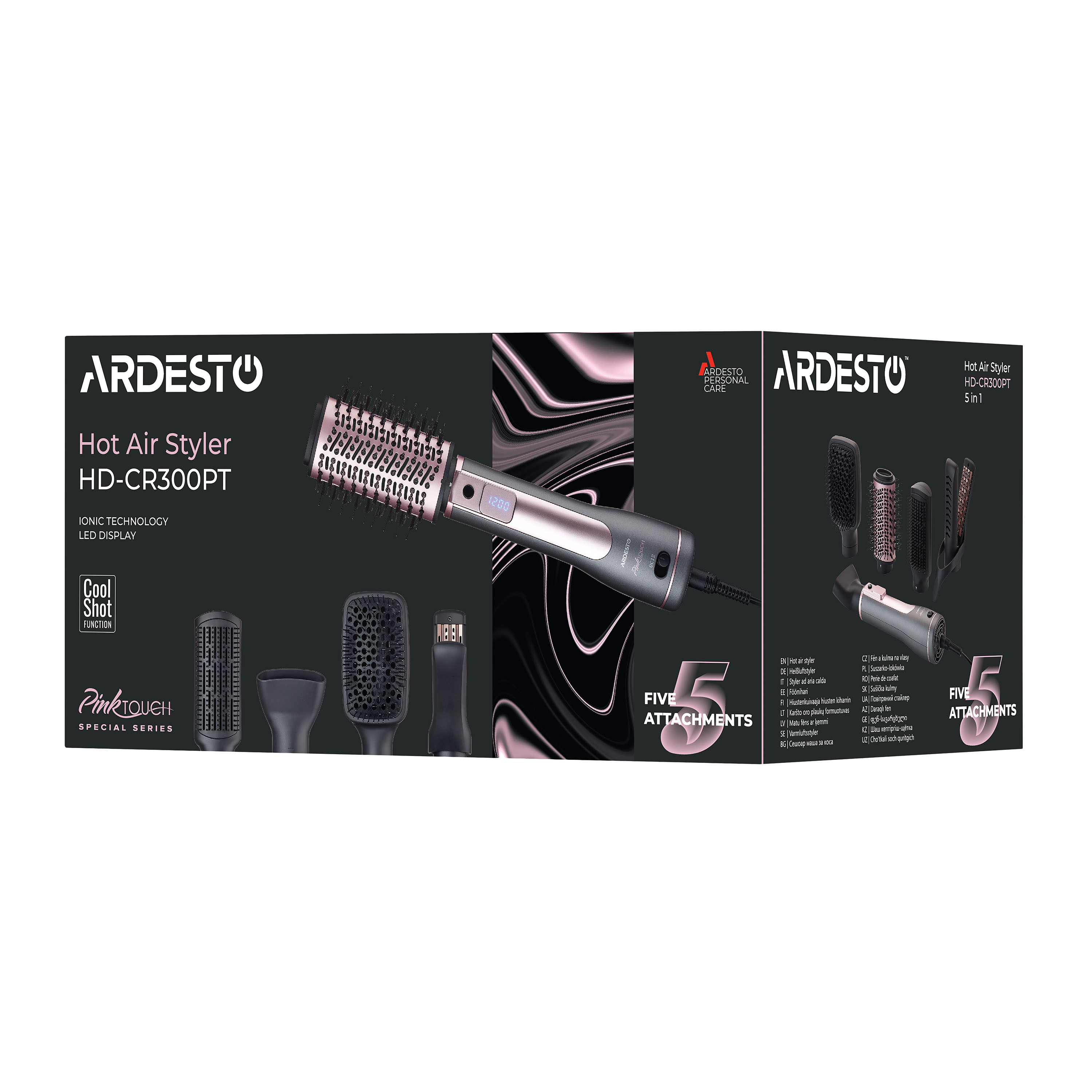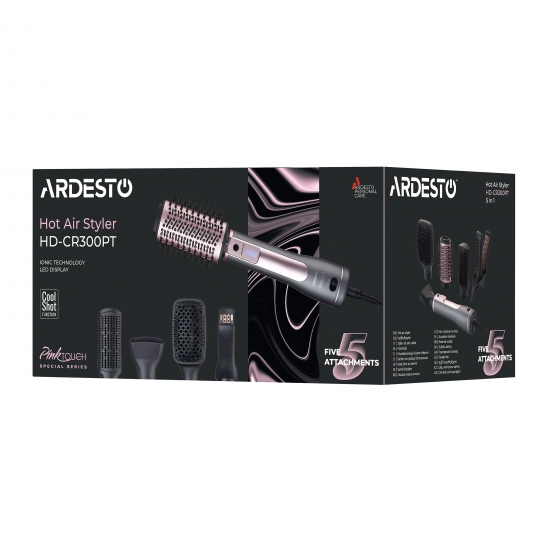 ARDESTO Brush Pink Touch – універсальний інструмент для стайлінгу – має в комплекті п’ять насадок: фен-щітка для завивання, дві фен-щітки для сушіння та надання об’єму, щипці-гофре для створення прикореневого об’єму й концентратор для фена. Завдяки двом температурним/швидкісним режимам і функції Cool Shot цей стайлер надає широкі можливості для створення бажаної укладки. Технологія іонізації гарантує блиск і здоровий вигляд волосся, запобігаючи їх пересушуванню й пошкодженню.