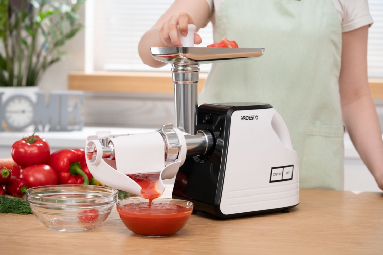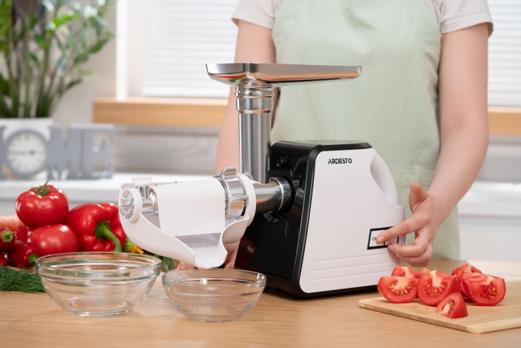 Де купити: М'ясорубка ARDESTO, 2300Вт, продук.-2.2кг/хв, 4 решітки + для ковб., кеббе, насадка для томатів, пластик, біло-чорний: