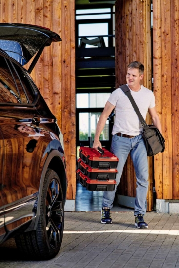 Завдяки внутрішнім розмірам 420,9 мм x 280,3 мм x 95,4 мм та максимальній навантажувальній вазі 25 кілограмів цей високоякісний системний кейс забезпечує максимальну гнучкість і може вмістити різноманітні пристрої, включаючи насадки та аксесуари, такі як гвинти та свердла. Дві вставки з поролону забезпечують захист від подряпин для обладнання, що зберігається або транспортується. Практична система фіксації для з'єднання складених кейсів разом гарантує, що все можна систематично та акуратно зберігати організовано, а складені кейси легко транспортувати, а завдяки розумній конструкції навіть складені кейси також можна відкривати. Корпус кейсу Einhell E-Case S-F виготовлений з високоякісного пластику і тому не тільки захищений від бризок завдяки ергомомічному дизайну, але також є термостійким та ударостійким. Для оптимального комфорту при транспортуванні є дві складні ергономічні ручки. Корпус може бути оснащений навісними замками для захисту від крадіжки.
