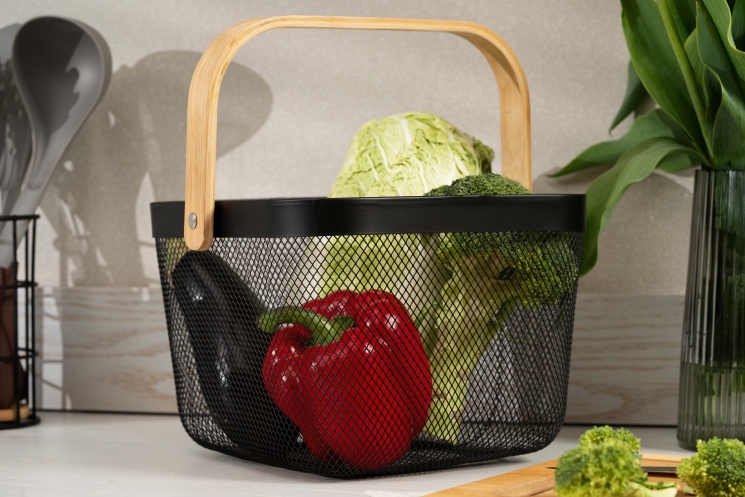 Фруктовниця ARDESTO Midori виготовлена в сучасному дизайні у вигляді металевого кошика чорного кольору з дерев’яною ручкою. Виріб функціональний і місткий (25 × 24,5 × 18 см). Фруктовницю легко чистити вручну. Це не просто практичний предмет посуду, а й стильний елемент декору, який доповнить інтер’єр кухні.