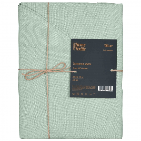 Стильна скатертина Oliver вдало доповнить інтер’єр їдальні чи кухні. Вироблена зі 100 % бавовни, вона вирізняється зносостійкістю та легкістю щодо догляду, проте для збереження первинного вигляду все ж варто зважати на рекомендації: прати в машині за делікатного режиму (30 °C); не сушити в сушильній машині, а тільки у вертикальному положенні; прасувати за температури до 150 °C; також заборонено відбілювання та хімчистка. Скатертина діаметром 136 см оптимально згодиться для круглих столиків, а з огляду на непересічний колір (аквамарин) вона допоможе додати яскравий акцент сервіруванню.