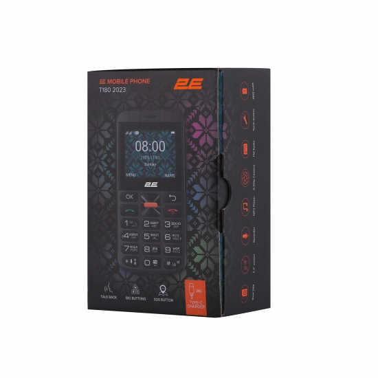 2E T180 MAX вдало поєднує класичний стиль і зручність. Його 2,31-дюймовий кольоровий екран із горизонтальною орієнтацією і роздільною здатністю 320 × 240 пікселів робить користування телефоном надзвичайно зручним, адже шрифти та іконки головного меню збільшені для кращої читабельності. Класичний дизайн у чорному кольорі з матовою поверхнею корпусу чудово доповнюють помаранчеві акценти на клавіші SOS, боковому слайдері керування ліхтариком і центральній навігаційній клавіші. Великі пластикові клавіші з підсвічуванням – запорука легкого набору номерів і керування меню. Телефон зручно лежить у руці завдяки товщині лише 13 мм, а отвір для кріплення ремінця додає зручності під час носіння.