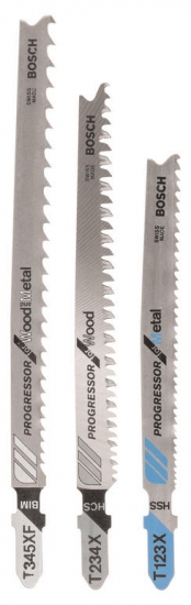 Набір з трьох пильних полотен Bosch - по дереву та металу T 345 XF, по дереву T 234 X, по металу T 123 X. Пилки Progressor з Т-подібним хвостовиком.