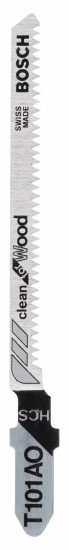 Пилка Bosch T 101 AO довжиною 82 мм, з поверхнею з зубцями 59 мм, з кроком зубців 1,4 мм, 19 TPI. Із високовуглецевої HSC сталі. Виконує чисте, криволінійне різання м'якої деревини та ДСП товщиною 1,5-15 мм. В упаковці 2 шт.