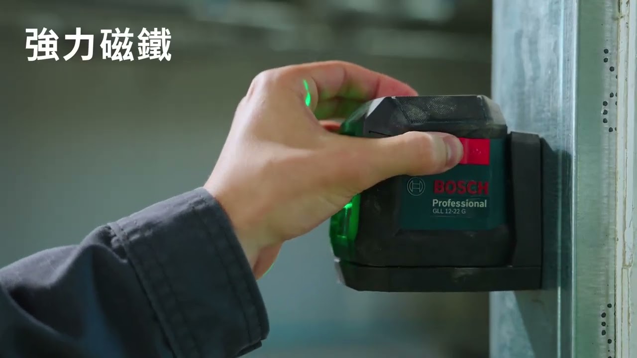 GLL 12-22 G — міцний лінійний лазер з добре видимими зеленими лазерними лініями для швидкого і точного вирівнювання на будівельних майданчиках. Цей компактний інструмент призначений для роботи у важких умовах. Він захищений від пилу та водяних струменів гумовим армованим корпусом зі ступенем захисту IP55. Вбудоване поворотне кріплення з потужними магнітами забезпечує стабільне закріплення і захищає об'єктив лазера під час зберігання або транспортування.