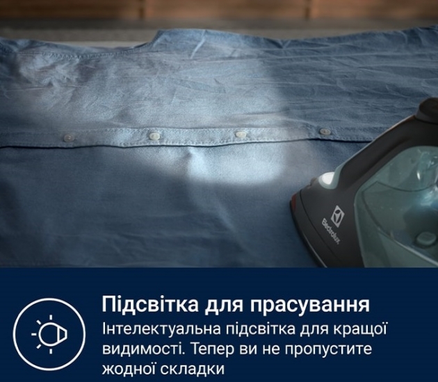 Смарт-підсвітка вказує на готовність приладу до використання і підсвітлює тканину, завдяки чому прасування стає простішим. Тепер ви не пропустите жодної складки.