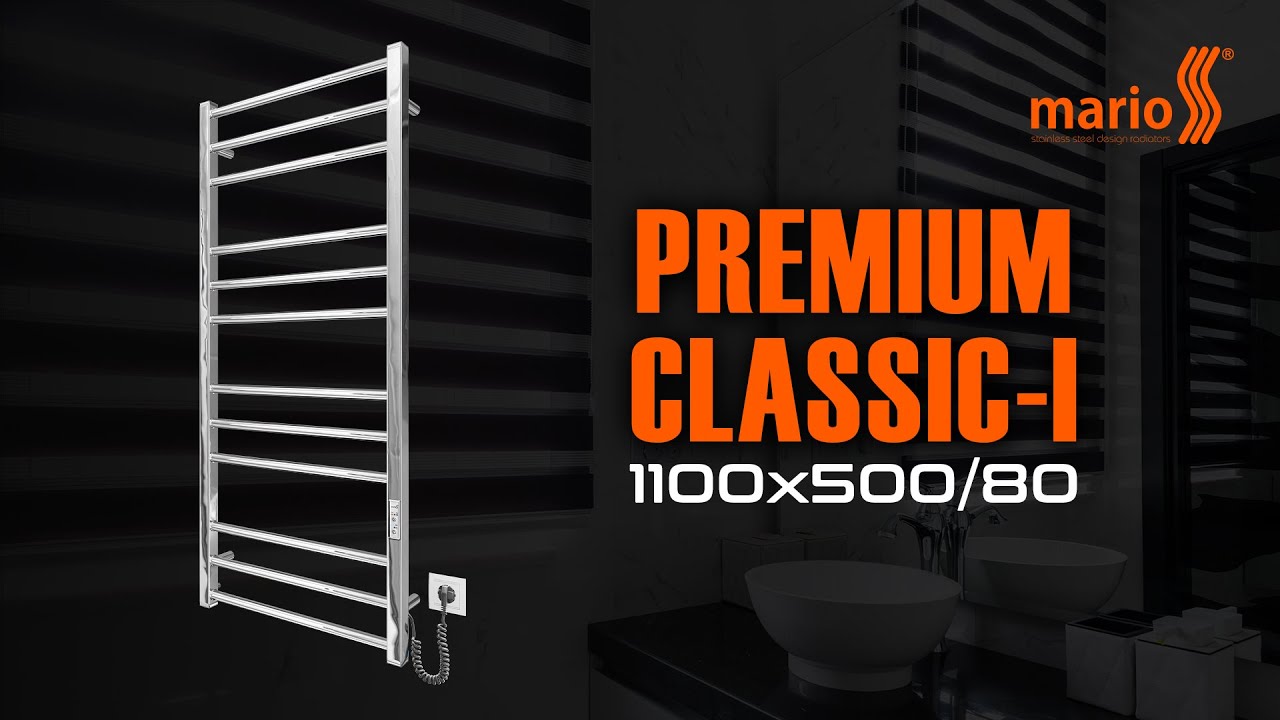 Електросушарка для рушників побутова Преміум Класік-I 1100х500/80 TR К. Обладнана таймер-регулятором та конектором для підключення в розетку з будь-якого боку. Сумісна з комплектом прихованого підключення. Має 12 ребер та стояки з профільної труби.