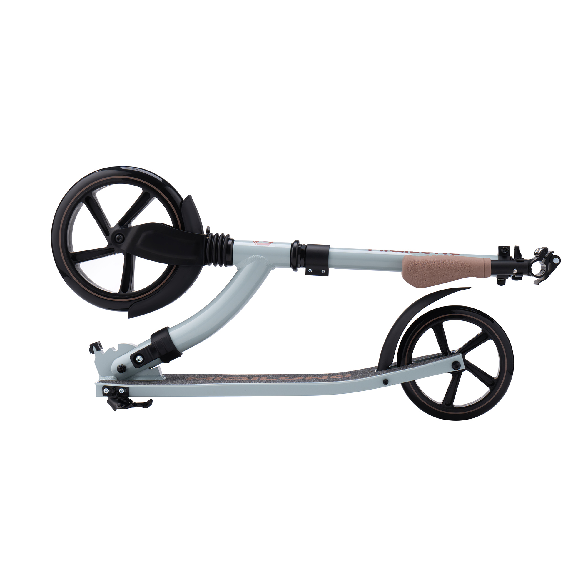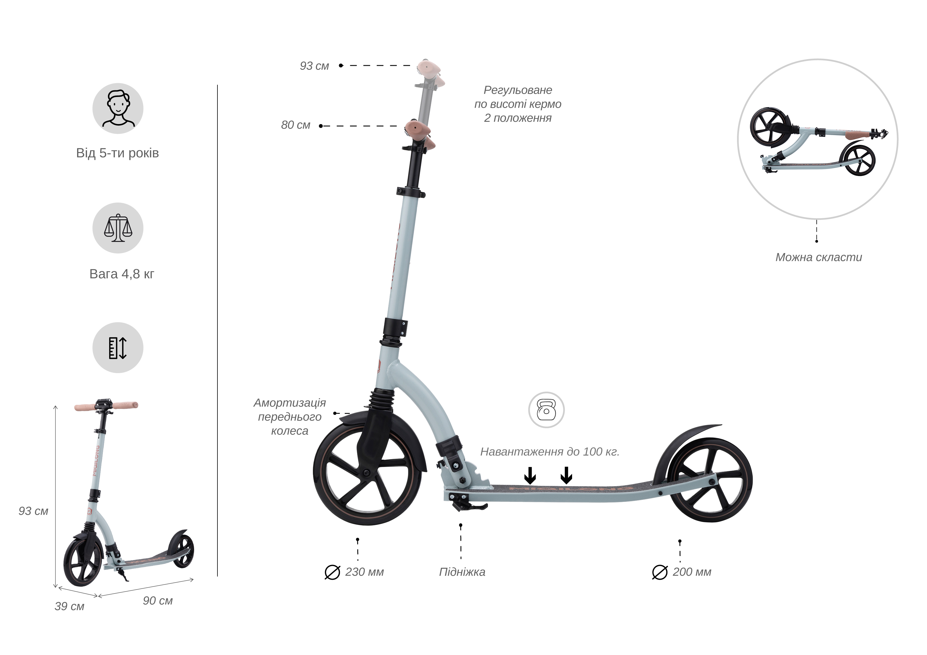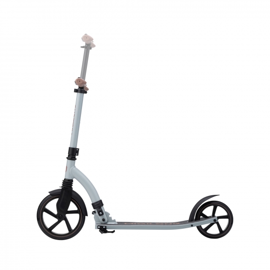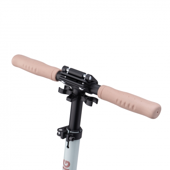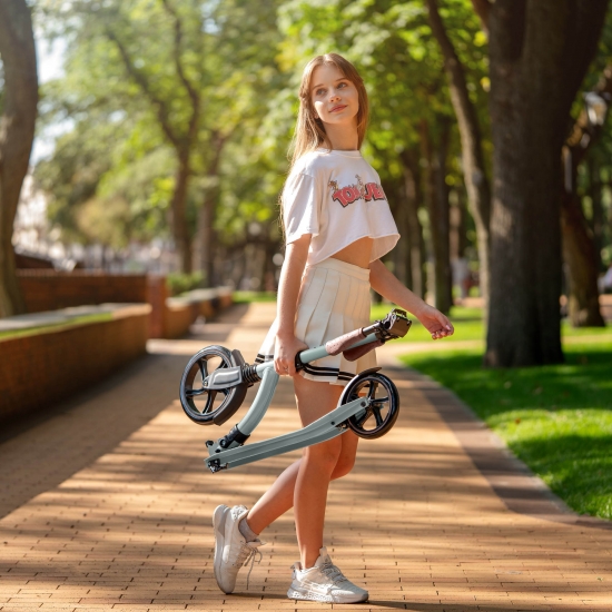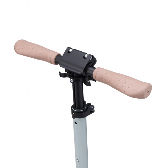 Для зручності зберігання та транспортування самокат повністю складається, включаючи ручки. Ручки фіксуються затискним механізмом, який забезпечує повну відсутність вібрації в місцях фіксації.