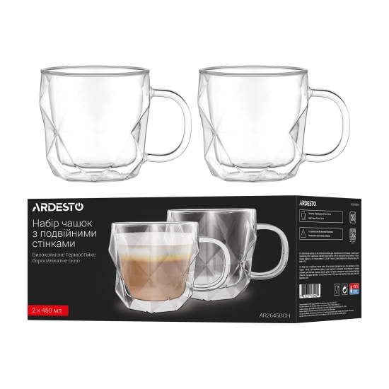 Технічні характеристики Набір чашок з ручками і подвійними стінками ARDESTO, 450мл, 2шт, боросилікатне скло, прозорий: