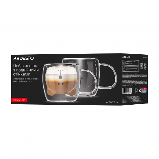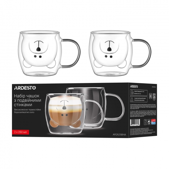 Опис Набір чашок з ручками і подвійними стінками ARDESTO Animals, 250мл, 2шт, боросилікатне скло, прозорий