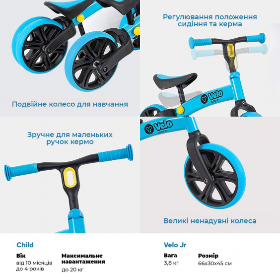 YVelo - це ідеальний засіб для розвитку дитячого почуття рівноваги, координації рухів, контролю, уваги, а також самостійності та впевненості у собі! Крім того, окрім стильного та привабливого дизайну, YVelo є високотехнологічним. Конструкція спеціально розроблена для стимулювання розвитку у дитини координації та навичок балансу. Використання біговела значно підвищує ймовірність того, що ваша дитина перейде на звичайний велосипед у віці 3 або 4 роки без необхідності використовувати додаткові тренувальні колеса.